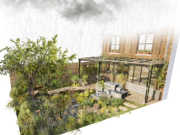 “The garden addresses heavy rain and flooding by making water a central feature. It slows flow with dense planting, captures water for later use, and has elevated spots for wildlife. Key features include flood barriers, and a central swale for drainage. This forms a stream, channeling rainwater into a feature pond where it can gradually soak away.”
