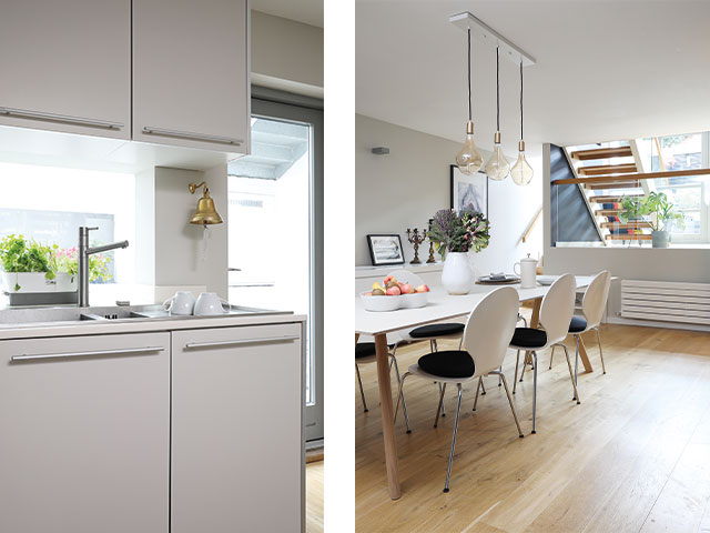 Left: Off the kitchen is a door leading to another small patio area, where Luana sometimes has breakfast. ‘Along with the rear decked patio, there’s also a little roof terrace, so it’s nice having three different outside spaces’, she says. Right: The glass balustrade and open-tread stairs enable plenty of borrowed light to come through the large windows at the rear. ‘I picked a classic Scandi design table by Hay and teamed it with chairs from John Lewis & Partners that won’t date.’ Photos: Katie Lee