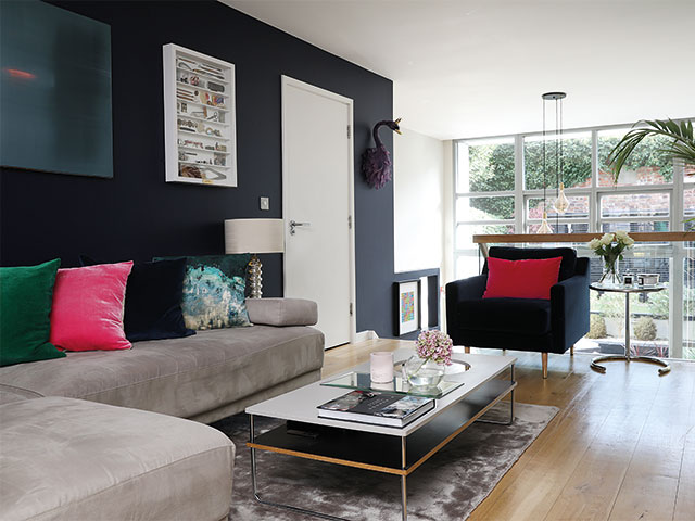 A dark feature wall painted in Dock Blue by Little Greene makes Luana’s artworks – including a framed glass box of memorabilia found in her late father’s sculpting studio – stand out, while creating a contrast with the lighter faux-suede sofa from Habitat. ‘I like a bold pop of colour, so the pink velvet cushion from John Lewis & Partners works well,’ she says. Photo: Katie Lee