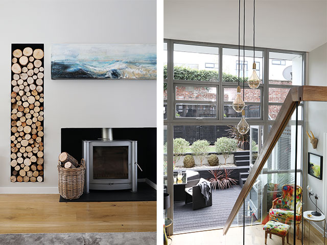 Left: The wood burner was already in situ but Luana has painted behind to accentuate it. ‘I created the artwork myself many years ago from leftover paint, and it fits perfectly in this space,’ she says. Right: A trio of pendants from Tala Lighting make the most of the ceiling height and complement the glass balustrade. ‘I love the unusual split-level layout,’ says Luana. ‘It’s what originally drew me to the house’. Photos: Katie Lee