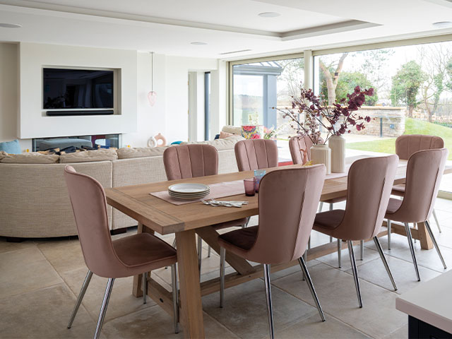 The pink Brambles dining chairs, from Furniture Village, match with an Arundel rectangular table by Neptune. ‘The big, curved sofa that we move to after dinner was a bargain in the sale at Stokers Furniture.’ Photo: David Giles