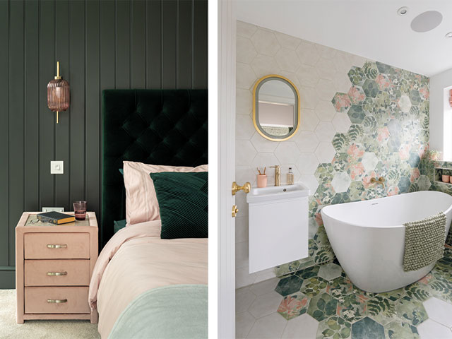 Left: In the guest room, panelling painted in Little Greene’s Lamp Black complements the Amalfi velvet bed in dark green by Danetti. Right: National Trust Woodland Glade hexagon tiles by Ca’ Pietra provide a stunning backdrop for the tub in Kate’s en suite. ‘I just fell for them immediately and knew I had to use them somewhere,’ says Kate. Photos: David Giles