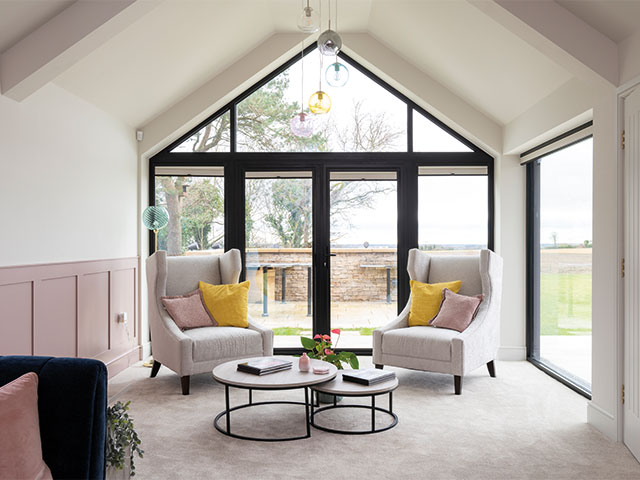 The other end of the living room has fantastic views out over the fields, and Kate has added two armchairs from Sofology and tables from Next Home’s Bronx range, continuing the mustard detailing with some cushions from Dunelm. Photo: David Giles