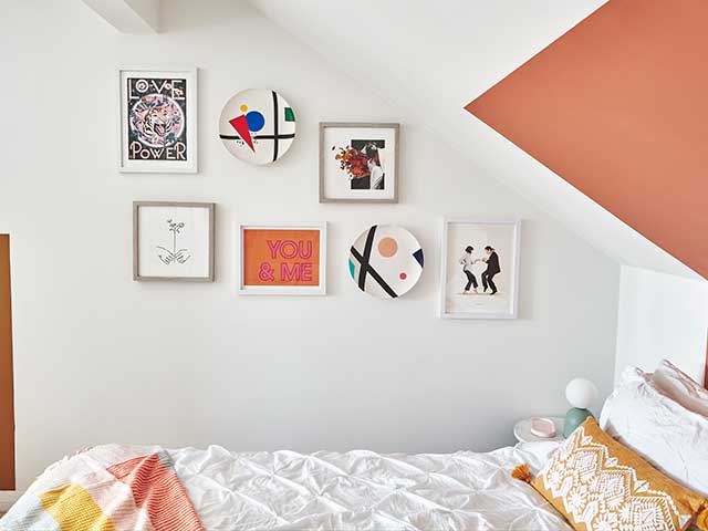 To display your artwork more playfully, Ryan McDonough at MyJobQuote.co.uk advises thinking about painting plain frames with dots, squiggles and checks or painting the wall behind your pictures to frame your gallery area.