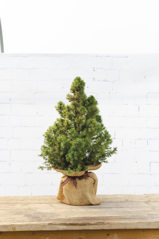 This real mini tree in rustic hessian wrap is a great way to bring Christmas cheer into any size home.