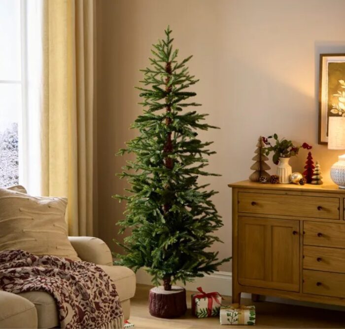 - 6ft Slim Alpine Christmas Tree in Wooden Base, £79 – buy here