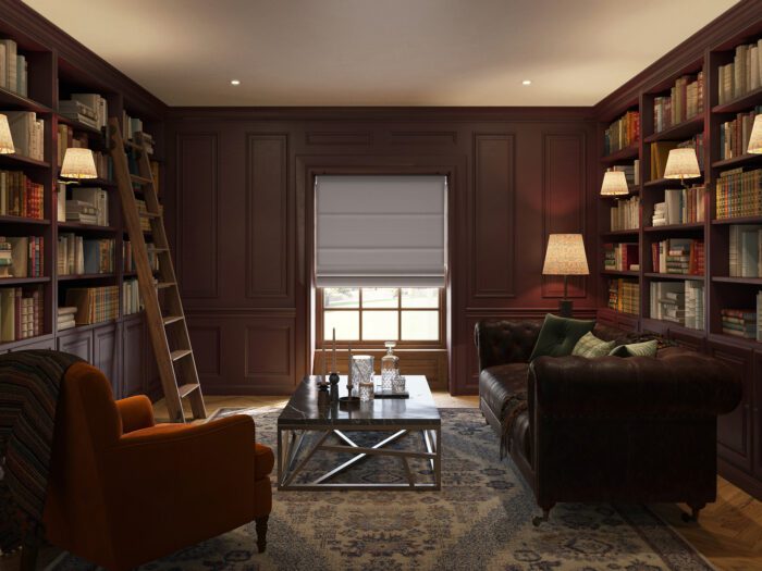 Traditional library look featuring Roman blind from 247 Blinds. Image credit: 247Blinds