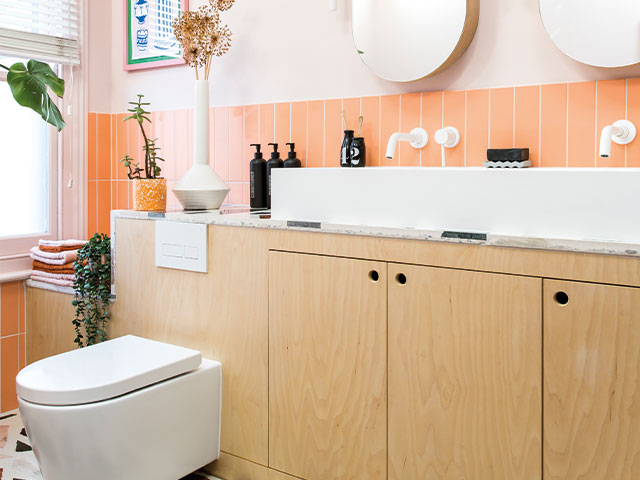 Lauren wanted to reflect her passion for colour and pattern. She based her design around Lusso Stone’s Picasso tub, adding pale coral tones on the walls, including YesColours’ environmentally friendly paint, and recycled marble and granite terrazzo floor tiles. Photo: Lizzie Orme