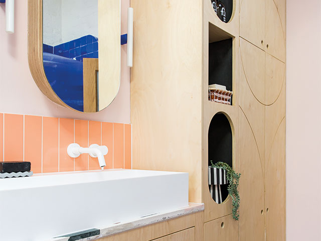 Made bespoke by Portico Design & Build, the birch plywood cupboards, which are naturally water-resistant, make great use of the wall space. The carpenter also made the curved mirrored wall units to match, which have additional storage inside. Photo Lizzie Orme