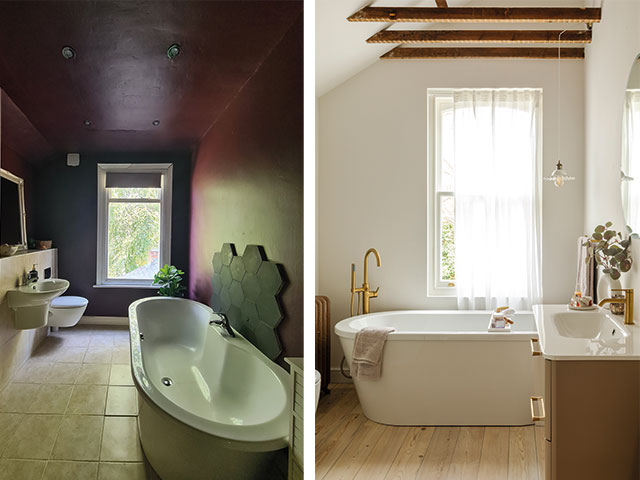 Exposing the rafters by vaulting the ceiling adds the wow factor to this family bathroom, where the couple have installed a sash window Emma sourced at a reclamation yard, and repositioned the bath to make the most of the view. Right photo: Fiona Walker-Arnott