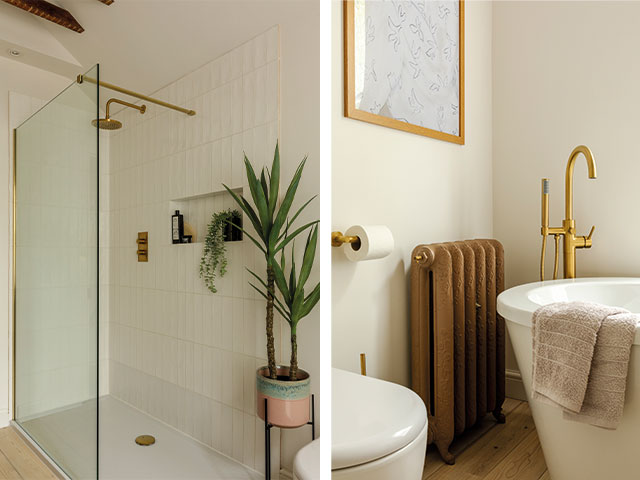 Left: Emma chose elegant brushed-brass fittings and a rainfall showerhead for a spa touch, while the tiled wall recess provides a practical yet chic storage solution. Right: The upcycled radiator, an internet find, is a perfect foil for the brushed brass floor-standing bath taps. Photos: Fiona Walker-Arnott