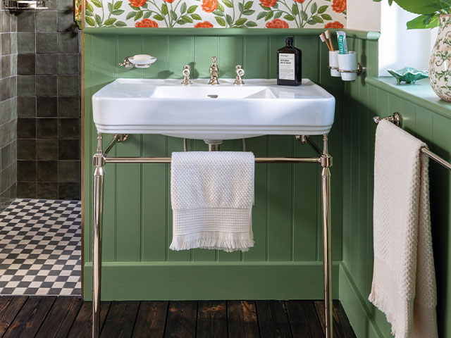 Set off by a floral feature wall above, a classic basin and stand has been teamed with gold brassware Photo: David Giles