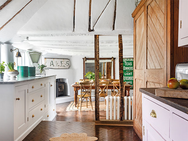 ‘We replaced the concrete floor with suspended reclaimed flooring, lime-plastered the walls, installed central heating, repaired all the woodwork, refurbished the fireplaces, put in casement windows, opened up the kitchen space and replaced the kitchen and bathrooms,’ says Sarah.
