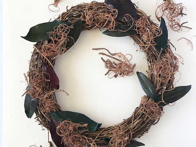 Be sure to space them out evenly to help Using the hot glue gun, glue all leaves and some curly twigs to the base – ensuring you space them out evenly.
